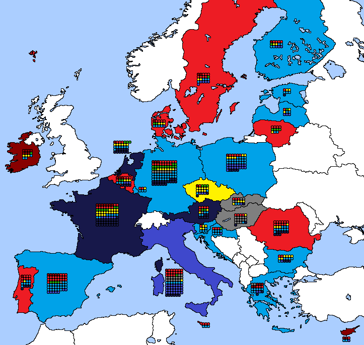 I will say in advance that it is next to impossible for me to be able to keep this up to date, 27 countries are hard to follow on polls and the bigger ones get a ridiculous number of polls like per week so this is already out of date but should give you a general picture.
